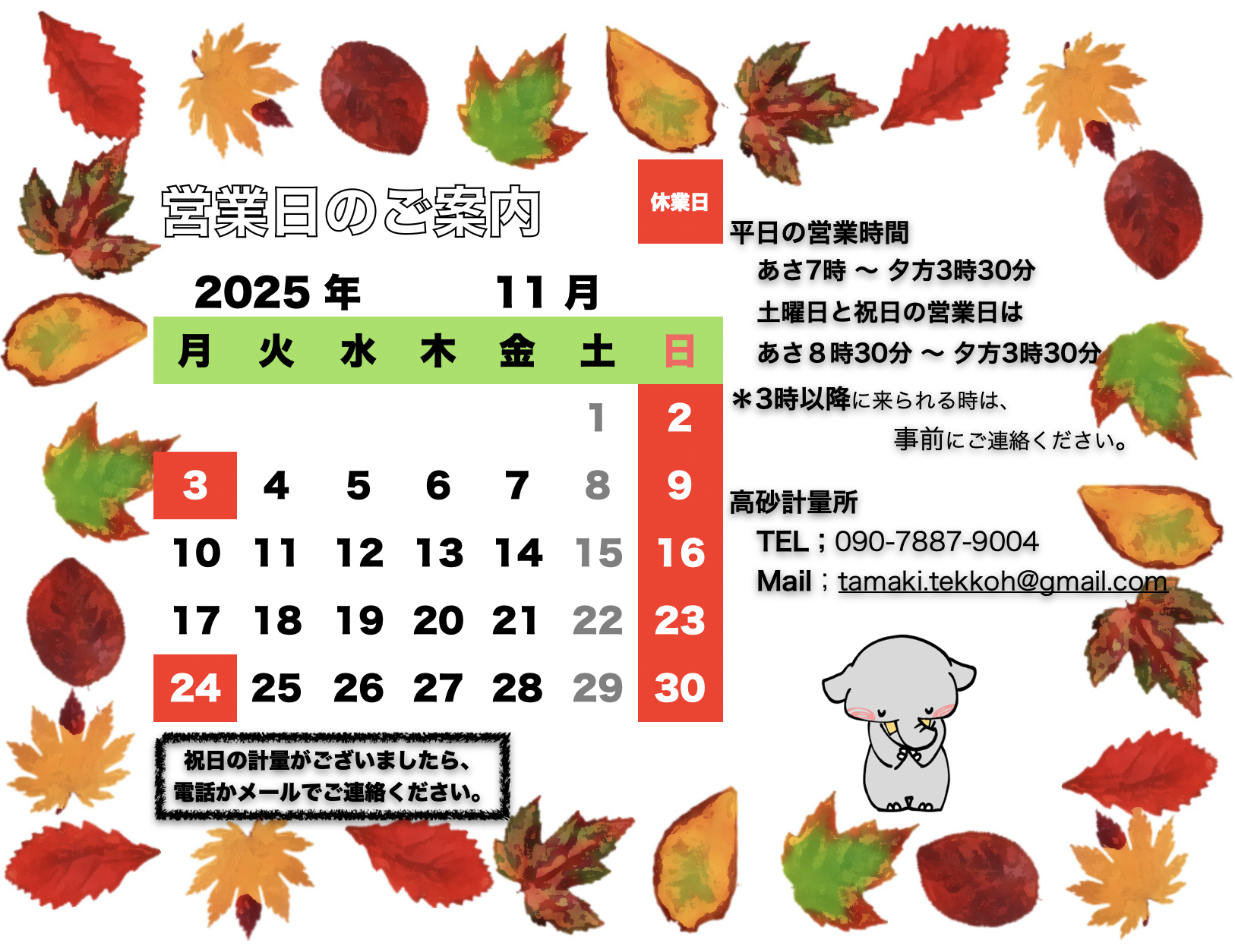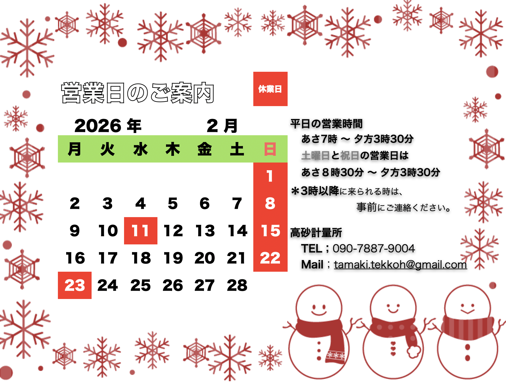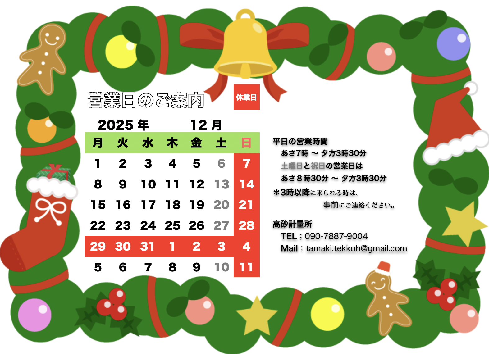 今月の営業日